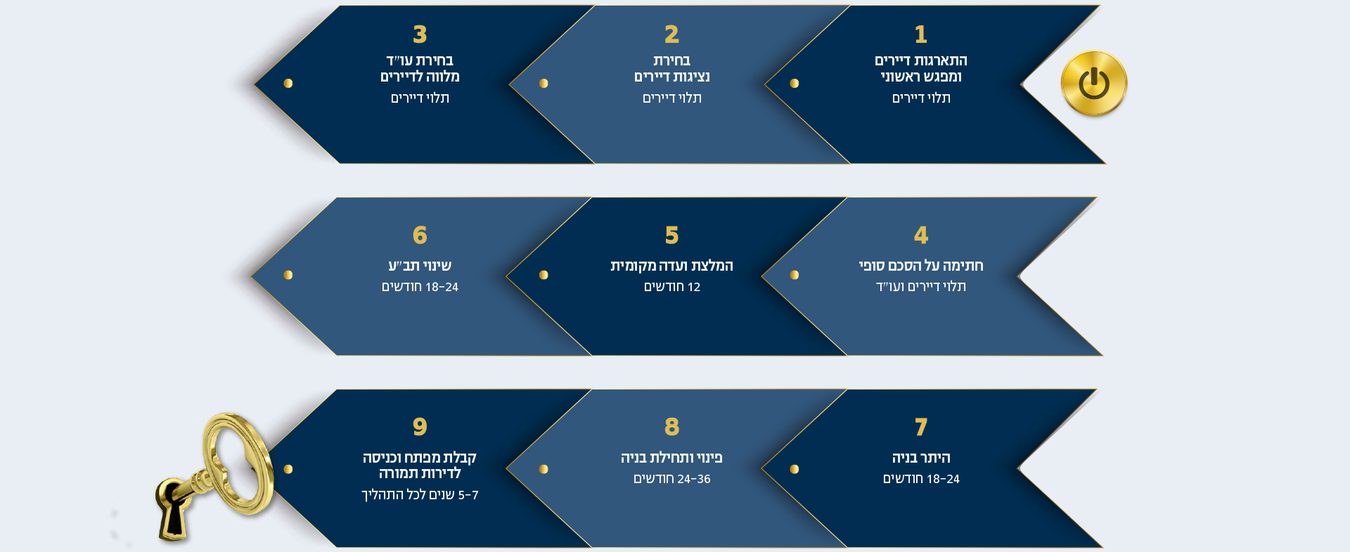 אנו מתחייבים ללוות אתכם לאורך כל שלבי הבנייה ולהיות זמינים לכם כל שאלה תוך שיתוף מלא שלכם לאורך כל שלבי בניית דירתכם החדשה.